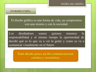 El documento presenta los elementos fundamentales del proceso de comunicación gráfica. Explica que el emisor concibe y transmite el mensaje utilizando un código y canal, el receptor lo recibe e interpreta, y existen filtros culturales que afectan esta interpretación. También describe los componentes clave del mensaje como el contenido y estilo, así como la retroalimentación que permite corregir el proceso comunicativo.