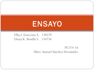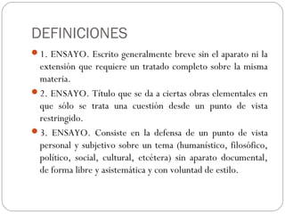 Este documento define el ensayo y describe sus diferentes tipos y características. Explica que el ensayo es un escrito breve que presenta una opinión personal sobre un tema. Luego describe los ensayos literarios, por definición, científicos y académicos. También cubre la estructura típica de un ensayo, incluida la introducción, el desarrollo y la conclusión, así como la bibliografía.