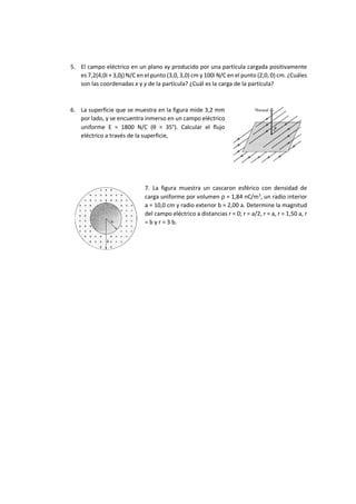 1. El documento presenta 7 problemas sobre fuerzas electrostáticas y campos eléctricos. Los problemas involucran calcular la fuerza sobre un electrón cerca de una barra cargada, determinar la masa de una esfera colgada entre dos cuentas cargadas, y calcular la longitud de un resorte y la carga en él basado en fuerzas electrostáticas.