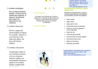 Este documento describe la electrostática y los beneficios de empleo de Editorial Don Leopoldo. La electrostática estudia los efectos mutuos entre cuerpos cargados eléctricamente. Editorial Don Leopoldo ofrece un plan de beneficios completo incluyendo seguro médico, dental y de vida, así como vacaciones pagadas y fondos de jubilación.