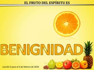 Este documento describe la benignidad como un fruto del Espíritu. Explica que Dios es benigno y actúa benignamente con todos, incluso con los injustos, por lo que los cristianos deben seguir su ejemplo amando a sus enemigos y tratando bien a quienes los odian. También enfatiza la importancia de usar palabras y actos benignos en todas las interacciones, y que al reflejar la benignidad de Dios, los creyentes pueden tener una influencia positiva en los demás y ayudar a que escuchen el mensaje de salvación.