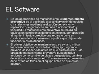 El documento describe los diferentes tipos de mantenimiento preventivo, incluido el mantenimiento programado, predictivo y de oportunidad. Explica que el mantenimiento preventivo en informática implica revisar el hardware y software de una computadora para garantizar un funcionamiento confiable y la integridad de los datos. También detalla algunos componentes clave de hardware como la caja de la CPU, tarjeta gráfica y disco duro que requieren mantenimiento preventivo para evitar sobrecalentamiento u otras averías.