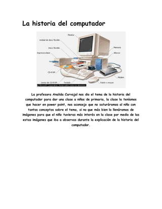 El documento describe varios proyectos educativos realizados por estudiantes bajo la guía de la profesora Analida Carvajal. Los estudiantes crearon presentaciones en PowerPoint sobre las maravillas del mundo y sobre la historia del computador, así como folletos y páginas web en Publisher sobre temas como Microsoft Office y el sistema solar. También hicieron tablas comparativas en Word sobre diferentes versiones de Windows y aprendieron a crear carpetas y hacer preguntas. Finalmente, grabaron videos para complementar sus blogs.
