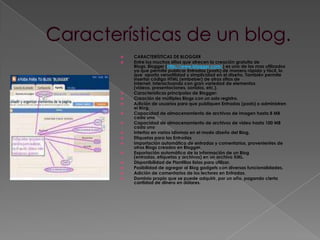 Un blog es un sitio web periódicamente actualizado que recopila artículos de uno o más autores de forma cronológica, mostrando primero el más reciente. Los blogs permiten a los autores publicar libremente y ofrecen varias ventajas como fomentar la expresión creativa, construir una imagen personal y facilitar la difusión y el debate de ideas.