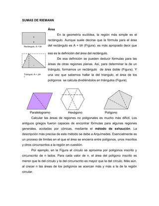 El documento describe los conceptos fundamentales de las sumas de Riemann. Explica que las sumas de Riemann permiten calcular el área bajo una curva dividiendo el intervalo en subintervalos y sumando el área de los rectángulos formados. También define formalmente las sumas de Riemann y explica que al aumentar el número de subintervalos, las sumas superior e inferior convergen al valor real del área.