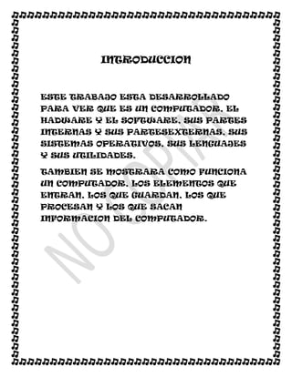 Este documento describe las partes internas y externas de un computador. Explica que un computador es una máquina que puede recibir, almacenar, procesar y enviar información. Detalla las partes como la tarjeta madre, procesador, memoria, puertos y periféricos de entrada y salida como teclado, mouse, pantalla y parlantes.