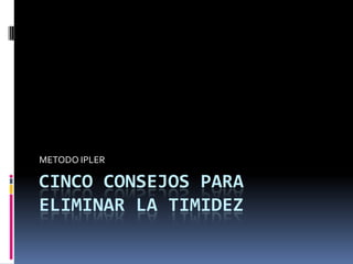 El documento presenta el método IPLER para mejorar la comprensión lectora. Consiste en 5 pasos: inspeccionar, preguntar, leer, expresar y revisar. Luego aplica este método a un texto sobre cinco consejos para superar la timidez: 1) ayudar a otros en lugar de enfocarse solo en uno mismo, 2) practicar habilidades conversacionales, 3) preguntar sobre temas de interés, 4) explicar la timidez a otros para obtener apoyo, 5) recompensarse por pequeños avances. Finalmente, clas