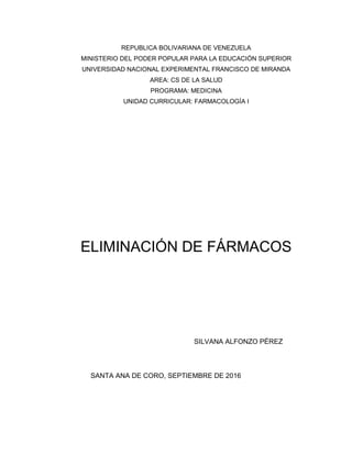 Este documento resume los principales mecanismos de eliminación de fármacos del organismo, incluyendo el metabolismo, la excreción renal, biliar e intestinal. Explica conceptos clave como la semivida de eliminación, el aclaramiento y la cinética de primera y cero orden. Además, destaca la importancia de entender la eliminación de fármacos para ajustar las dosis y tener en cuenta factores que pueden alterarla.
