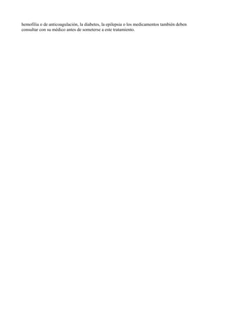 La cavitación ultrasónica utiliza ondas de ultrasonido para romper células de grasa y liberar triglicéridos que luego son eliminados por los sistemas circulatorio y linfático. El procedimiento es seguro, no doloroso e indoloro, y puede eliminar depósitos de grasa de manera permanente con 12 sesiones semanales. Aunque no tiene efectos secundarios, se contraindica durante el embarazo, menstruación o para personas con ciertas enfermedades o condiciones médicas.