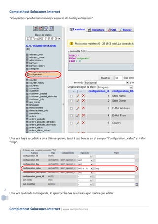Este documento describe cómo eliminar advertencias en OsCommerce. Explica que las advertencias se deben a que OsCommerce asigna una ruta de archivo temporal incorrecta. Indica que para solucionarlo, el usuario debe acceder a la base de datos, buscar la configuración "tmp" y modificar su valor a la ruta correcta "/usr/home/sudominio.com/tmp". Una vez realizados estos cambios, dejarán de aparecer las advertencias.
