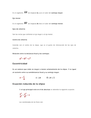 La elipse es el lugar geométrico de los puntos cuya suma de distancias a dos puntos fijos llamados focos es constante. Una elipse tiene dos semiejes perpendiculares, un centro, y sus vértices se encuentran donde los semiejes intersectan la curva. La ecuación de una elipse depende de la orientación de sus semiejes y la posición de su centro.