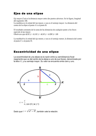 Una elipse es una curva cerrada plana definida como el conjunto de puntos cuya suma de distancias a dos puntos fijos, llamados focos, es constante. Una elipse tiene dos ejes perpendiculares entre sí llamados eje mayor y eje menor, y dos focos situados a los extremos del eje mayor. La excentricidad de una elipse indica qué tan aplanada es y depende de la relación entre el semieje mayor y la distancia entre los focos.