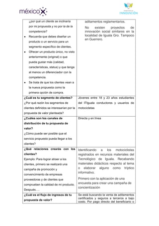 El documento presenta un producto mínimo viable (PMV) llamado 'Moto Cultura Vial', diseñado para reducir los accidentes de tránsito en México, especialmente entre motociclistas jóvenes. Se propone fomentar la educación vial y ofrecer aditamentos certificados, coincidiendo con la falta de iniciativas similares en la región. La estrategia implica una campaña de concientización y colaboración con organizaciones gubernamentales y educativas, enfocándose en un segmento de clientes específico y utilizando canales de distribución tanto directos como en línea.