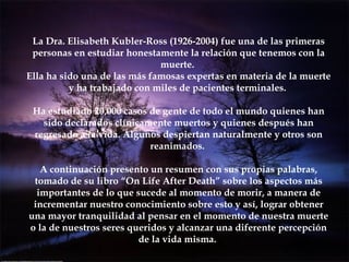 La Dra. Elisabeth Kubler-Ross estudió la experiencia de morir y descubrió que consiste en tres etapas: 1) separarse del cuerpo físico, 2) experimentar una nueva forma de conciencia donde se puede ver y oír lo que pasa a su alrededor, y 3) encontrarse rodeado por una luz brillante que transmite amor incondicional. Al morir, las personas se dan cuenta de que nadie muere solo y que son recibidas por seres queridos o figuras significativas.