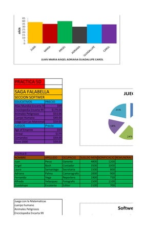 Este documento contiene varias tablas con información sobre compañías de seguros, software educativo, sueldos de empleados, ventas de una librería y descuentos de nómina. Presenta datos como nombres, códigos, precios, cargos, sueldos, bonificaciones, impuestos y descuentos de seguridad social de diferentes empresas y trabajadores.