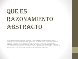 El razonamiento abstracto evalúa la capacidad de resolver problemas lógicos y deducir consecuencias de situaciones planteadas para descubrir la capacidad de razonamiento y análisis. El razonamiento es un componente clave de la inteligencia general y, junto con el razonamiento verbal, forma parte de las habilidades cognitivas.