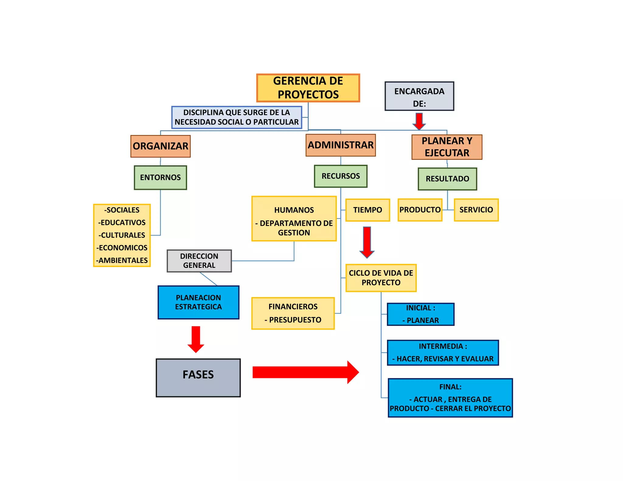 La gerencia de proyectos se encarga de organizar diferentes entornos como sociales, educativos y ambientales, administrar los recursos humanos y financieros, y planear y ejecutar proyectos desde la fase inicial hasta la entrega final del producto o servicio. El ciclo de vida de un proyecto incluye las fases de planear, hacer, revisar y evaluar, y actuar para cerrar el proyecto.