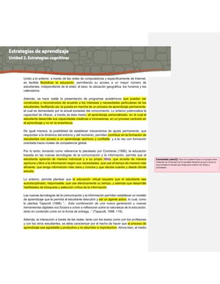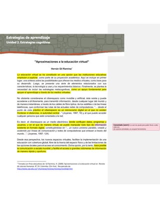 La educación virtual se ha convertido en una opción explorada por instituciones educativas. Ofrece flexibilidad espacial y temporal, permitiendo el acceso a programas académicos globales. El estudiante aprende de manera autónoma y a su propio ritmo a través de la red, interactuando con compañeros, profesores y contenidos. El desarrollo de estrategias metacognitivas por parte del estudiante puede contribuir a mejorar el aprendizaje virtual, mediante la planificación, evaluación y regulación del proceso cognitivo.