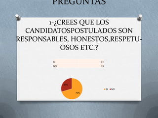 La mayoría de estudiantes cree que los candidatos no son responsables ni honestos y que el personero debería ser elegido por liderazgo y rendimiento académico. También opinan que el personero debería gestionar un presupuesto, equipo de trabajo y botiquín, así como hacer cumplir los derechos estudiantiles e impulsar más eventos deportivos y acceso a internet. Sin embargo, la mayoría no cree que el