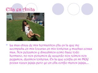 El documento presenta a cada uno de los hermanos de la persona que escribe. Describe las personalidades y las dinámicas que tiene con cada uno de ellos, incluyendo peleas y momentos divertidos. Aunque a veces se pelean y no están de acuerdo, la persona que escribe expresa su amor incondicional por cada uno de sus hermanos y los valora tal como son.