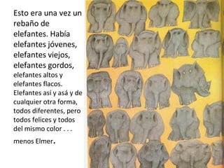 Esto era unavez un rebaño de elefantes. Había elefantes jóvenes, elefantes viejos, elefantes gordos, elefantes altos y elefantes flacos. Elefantes así y asá y de cualquier otra forma, todos diferentes, pero todos felices y todos del mismo color . . . menos Elmer.