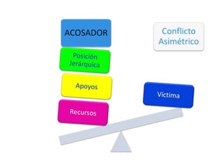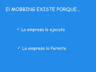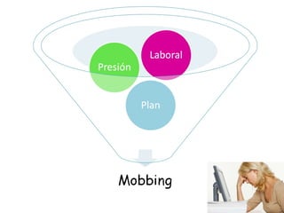 El documento habla sobre el mobbing o acoso laboral. Define mobbing como la violencia psicológica sistemática que se ejerce sobre una persona en el lugar de trabajo con el objetivo de que abandone su puesto. Describe las etapas y conductas de acoso, así como las consecuencias para la víctima, la empresa y la sociedad. Finalmente, explica posibles vías de solución interna en la empresa y vías de solución externas a través de la inspección de trabajo y acciones legales.