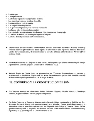 El documento resume los primeros años de México como nación independiente entre 1821 y 1855. Hubo intentos fallidos de establecer un gobierno estable, incluyendo el breve Imperio de Iturbide entre 1821-1823 y la promulgación de la primera constitución en 1824 que estableció un sistema federal. Sin embargo, las luchas entre facciones federalistas y centralistas llevaron a periodos de inestabilidad e incluso la dictadura de Santa Anna, quien abolió la constitución federal en 1835 e impuso un régimen centralista.