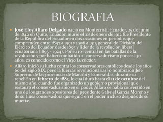 José Eloy Alfaro Delgado fue un político y militar ecuatoriano que se desempeñó como Presidente de Ecuador en dos períodos entre 1897-1901 y 1906-1911. Fue líder de la Revolución Liberal Ecuatoriana que combatió al conservadurismo durante casi 30 años. Sus administraciones consolidaron el Estado nacional ecuatoriano a través de la creación de instituciones como la Escuela Militar y extendieron los derechos y libertades de los ciudadanos.