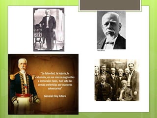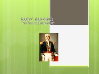 José Eloy Alfaro Delgado nació en Montecristi, Ecuador en 1842. Luchó contra dictadores como García Moreno y Veintenilla para establecer la democracia y libertad en Ecuador. Fue un líder liberal que impulsó la educación y el ferrocarril. A pesar de sus logros, fue asesinado cruelmente en 1912 por sus opositores conservadores.