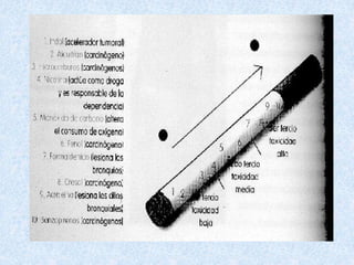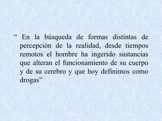 El documento analiza el uso de drogas a lo largo de la historia, indicando sus diversas clasificaciones, efectos en la salud, y motivos de consumo. Se destacan la marihuana, cocaína, alcohol, y tabaco, sus efectos inmediatos y a largo plazo, así como los riesgos de dependencia física y psicológica. Se subraya que todas las drogas afectan la salud y potencian comportamientos descontrolados, con un enfoque en la farmacodependencia y la farmacotoxicidad.