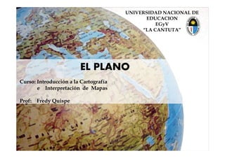 El documento explica la diferencia entre un mapa y un plano. Un mapa representa la superficie terrestre tomando en cuenta su forma elipsoidal, mientras que un plano no considera la curvatura de la Tierra y solo representa una pequeña porción de su superficie. Luego clasifica los diferentes tipos de planos como planos de planta, alzado, perfil y detalles, los cuales representan vistas de un objeto desde diferentes ángulos. Finalmente, brinda un ejemplo de cómo se dibuja un plano de planta para una casa simple.