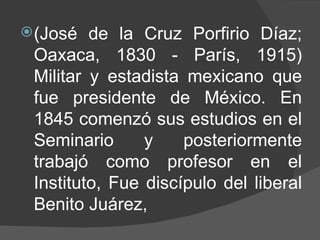 Porfirio Díaz fue un militar y estadista mexicano que fue presidente de México de 1876 a 1910, logrando la paz y el progreso económico pero también estableciendo un régimen autoritario. Aunque impulsó obras de infraestructura como ferrocarriles, telégrafos y puertos que mejoraron la economía, también aumentó la desigualdad social. Finalmente su largo gobierno generó descontento y llevó a la Revolución Mexicana de 1910 que lo derrocó.