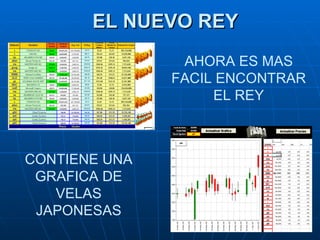 Este documento presenta las instrucciones para usar un programa llamado "El Rey 2.1" que ayuda a encontrar buenas oportunidades de compra de acciones. Explica que el programa proporciona los precios más altos y bajos históricos, y que cuando el precio y volumen actuales se vuelven verdes, es una buena oportunidad de compra. También describe los 8 pasos para usar el programa, que incluyen escribir símbolos de acciones, actualizar la información y buscar "El Rey Alto" y "El Rey Bajo".