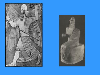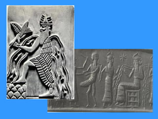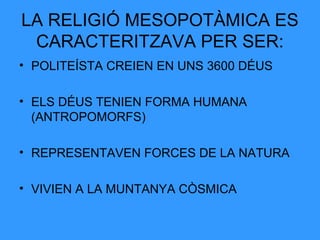 La religión mesopotámica era politeísta y creía en unos 3,600 dioses antropomórficos que representaban fuerzas de la naturaleza y vivían en la montaña cósmica. Cuatro granes dioses estaban asociados con la tierra, el agua, el aire y el cielo y crearon el resto de dioses y los humanos. La diosa Nammu fue la primera deidad y creó el cielo y la tierra, mientras que An era el dios del cielo y Ki la diosa de la tierra. Otros dio