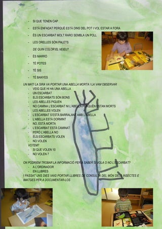 Este documento describe las observaciones de varios insectos realizadas por niños en una clase. Los niños identificaron y describieron las características físicas de marietas, escarabajos y abejas. También discutieron si los escarabajos pueden volar basándose en sus observaciones directas y en la información de libros.