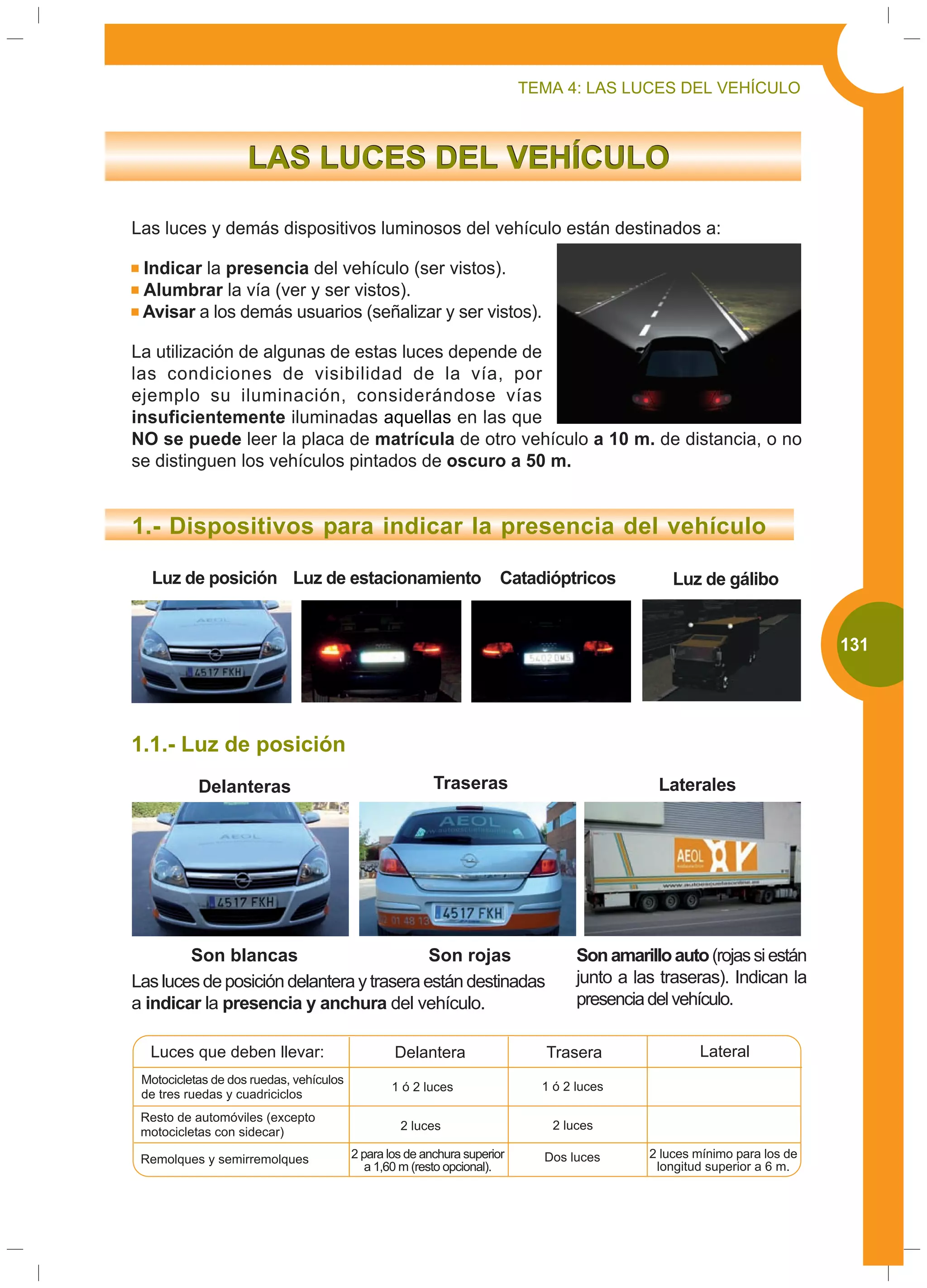 Las luces del vehículo cumplen tres funciones principales: 1) indicar la presencia del vehículo, 2) alumbrar la vía y 3) avisar a otros usuarios. Entre los dispositivos luminosos se incluyen las luces de posición, estacionamiento, corto alcance, largo alcance y antiniebla. Su uso depende de factores como la hora del día, la iluminación de la vía y la velocidad del vehículo.