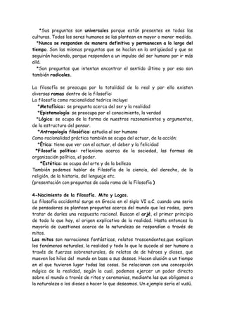 Este documento describe la filosofía, su origen y evolución. Comienza explicando que la filosofía significa amor a la sabiduría y que surge de la curiosidad humana ante el mundo. Luego resume las principales etapas históricas de la filosofía desde la antigua Grecia hasta la actualidad, destacando pensadores clave como Platón, Aristóteles, Descartes y otros. Finalmente, explica las relaciones entre la filosofía, la religión y la ciencia, y cómo la filosofía nos ayuda a reflexionar sobre la