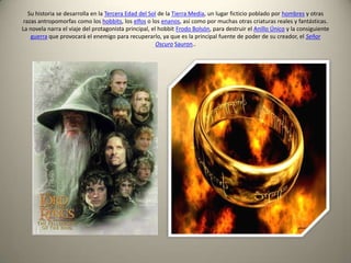 La novela narra el viaje del hobbit Frodo Bolsón para destruir el Anillo Único y derrotar al Señor Oscuro Sauron. Los principales personajes que le acompañan son Gandalf, Aragorn, Legolas, Gimli, Boromir y los hobbits Sam, Merry y Pippin. Tras varias batallas, Frodo es finalmente destruido el Anillo en el Monte del Destino, derrotando a Sauron pero a un alto costo para la Comarca y la Tierra Media.
