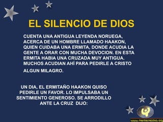 Este cuento noruego narra la historia de Haakon, un ermitaño que le pide a Dios cambiar lugares con él en la cruz. Dios acepta con la condición de que Haakon guarde silencio siempre. Más adelante, Haakon no puede permanecer en silencio cuando un hombre acusa falsamente a un joven de robarle, por lo que interviene. Como resultado, Dios y Haakon intercambian nuevamente lugares, y Dios le explica a Haakon que él sabía lo que sucedería y por eso