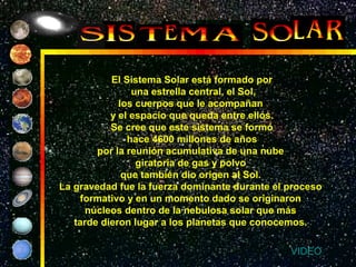 El Sistema Solar está formado por el Sol y los cuerpos celestes que orbitan a su alrededor, como planetas, asteroides y cometas. Se cree que se formó hace aproximadamente 4,600 millones de años a partir de una nube de gas y polvo que dio origen al Sol y los planetas. La gravedad jugó un papel importante en este proceso de formación, dando lugar a los núcleos planetarios a partir de la nebulosa solar original.