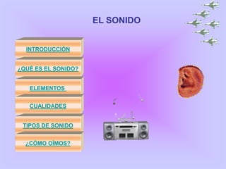 1) El documento explica qué es el sonido, los elementos necesarios para su existencia (una fuente de vibración, un medio elástico, y un receptor) y sus cualidades como la intensidad, el tono y el timbre.
