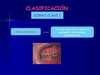 El documento clasifica y describe diferentes tipos de gomas o elásticos utilizados en ortodoncia. Identifica gomas clase I, II y III para corregir espacios y movimientos dentarios anteroposteriores. También describe gomas verticales, anteriores, en caja y asimétricas para cerrar mordidas abiertas y mejorar la oclusión. Finalmente, explica el uso de gomas de finalización entre los caninos y premolares superiores e inferiores para tratar clases II, III y mordidas abiertas.