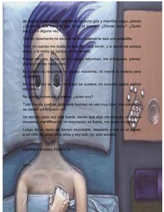 En el documento, el narrador describe una pesadilla en la que despierta en un lugar lúgubre y deteriorado sin saber quién es. Al mirarse en un espejo roto, ve el rostro de un anciano desconocido con muchas arrugas y sucio. Confundido y asustado, cae al suelo preguntándose quién es y dónde está. Finalmente despierta y ve su propio reflejo como un niño de 11 años, dándose cuenta que solo había sido una terrible pesadilla.