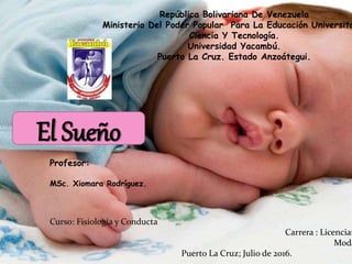 El documento resume las características fundamentales del sueño. Explica que el sueño pasa por diferentes fases cíclicas que permiten restaurar las funciones físicas y psicológicas. Describe las dos grandes fases del sueño - ondas lentas (NREM) y REM - y sus respectivas etapas y características fisiológicas. Finalmente, menciona algunos trastornos del sueño como las disomnias, parasomnias y alteraciones relacionadas con causas médicas o psiquiátricas.
