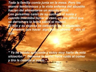 La familia colocó al abuelo en una mesa separada para comer solo debido a sus temblorosas manos y vista enferma que causaban desorden. El nieto de 4 años construyó tazones de madera para sus padres para cuando él creciera, para que también comieran solos. Esto conmovió a los padres, quienes devolvieron al abuelo a comer con el resto de la familia.