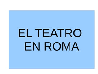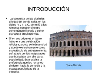 El documento describe el teatro en la antigua Roma. Los romanos conocieron el teatro a través de las ciudades griegas del sur de Italia. Inicialmente el teatro romano era una celebración religiosa, pero luego se convirtió en un entretenimiento financiado por magistrados para ganar popularidad. Los primeros teatros romanos fueron estructuras temporales, pero luego se construyeron teatros de piedra permanentes. Las comedias más populares eran adaptaciones de obras griegas, con personajes y ambientación griega (fabula palliata) o romana