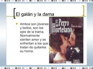 El documento resume las características principales del teatro barroco en España. Explica que alcanzó gran popularidad en el siglo XVII y se convirtió en un negocio profesional. También describe los lugares de representación como corrales de comedia, palacios y plazas. Resalta la influencia de Lope de Vega al establecer las bases de la comedia nueva con su libro Arte Nuevo de Hacer Comedia.