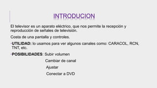 El documento detalla el funcionamiento y la instalación básica de un televisor, describiendo sus componentes y utilidades. Incluye instrucciones sobre cómo ensamblar el televisor, conectarlo y utilizar el control remoto para cambiar de canal y ajustar el volumen. También menciona los accesos y pasos necesarios para conectar equipos adicionales como un DVD.