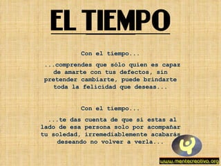 Este documento presenta una serie de lecciones aprendidas con el tiempo. En resumen, señala que 1) es mejor estar con alguien que te ame con defectos que por conveniencia, 2) los amigos verdaderos valen más que el dinero, y 3) las palabras dichas con ira pueden seguir lastimando a los demás.