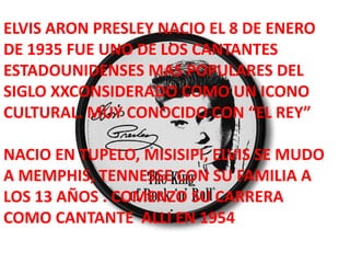 Elvis Presley nació en 1935 en Mississippi y se mudó a Memphis a los 13 años, donde comenzó su carrera musical en 1954. Considerado uno de los cantantes estadounidenses más populares del siglo XX, Presley tuvo una voz versátil y éxito en muchos géneros como country, pop, baladas, gospel y blues, vendiendo más discos que ningún otro artista en la historia de la música.